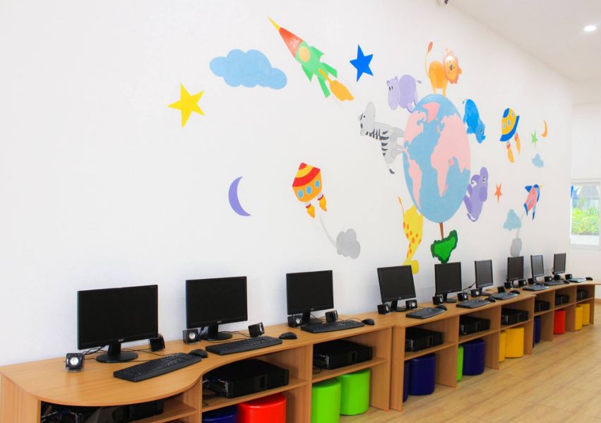 Trong lớp học tương tác, trẻ sẽ được tiếp cận công nghệ màn hình phẳng không sử dụng máy chiếu, kết hợp hệ thống âm thanh chất lượng trong không gian học tập đầy màu sắc vui nhộn. Giáo viên cũng sẽ dễ dàng tiếp cận phần mềm và học liệu phong phú, độc đáo để dạy đọc, viết và phát âm cho trẻ.
