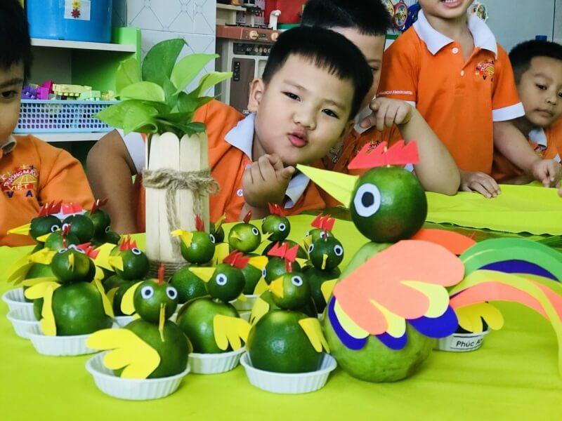 Trẻ được trải nghiệm kỹ năng chọn đúng màu, phân biệt đúng hình tròn to làm thân con gà, hình tròn nhỏ làm đầu con gà.