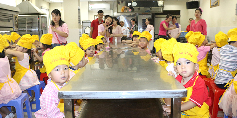 Ngay từ sáng sớm, các thiên thần nhí trong sắc áo hồng tươi vui hưởng ứng ngày hội hoạt động ngoại khóa đã cùng cô ăn sáng và háo hức di chuyển đến trường dạy nghề Nhất Hương để trải nghiệm công việc làm bánh thú vị. Trước khi bắt tay vào công việc, các con được rửa tay sạch sẽ, rồi cùng cô đầu bếp trò chuyện, giới thiệu tên các loại nguyên liệu để làm bánh. Nào là bột, quả trứng, trái cà, tôm, xúc xích. Các bạn nhỏ đã vui vẻ xung phong lên gọi tên và nhận được những tràng pháo tay cổ vũ nhiệt tình của bạn bè và các anh chị.